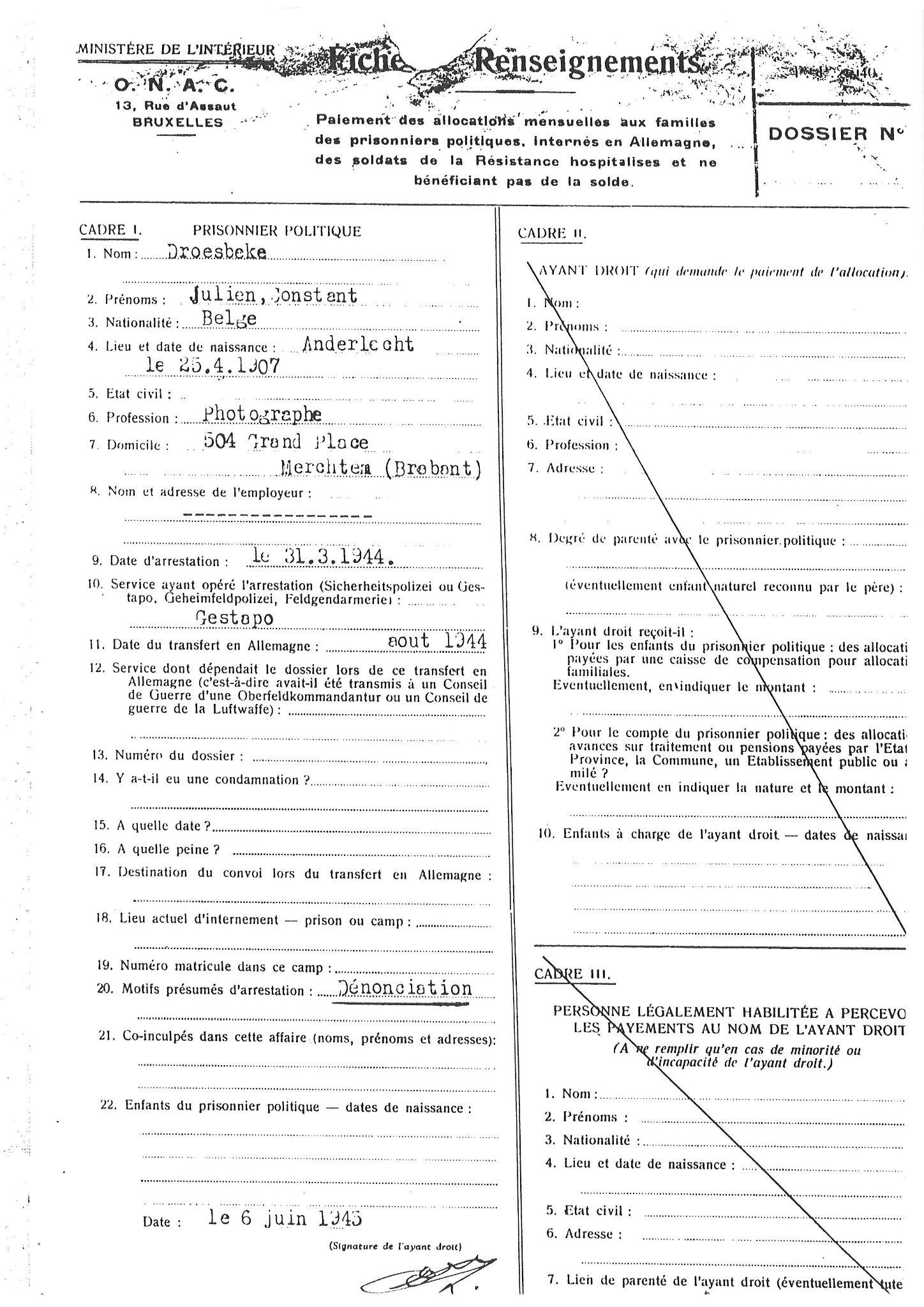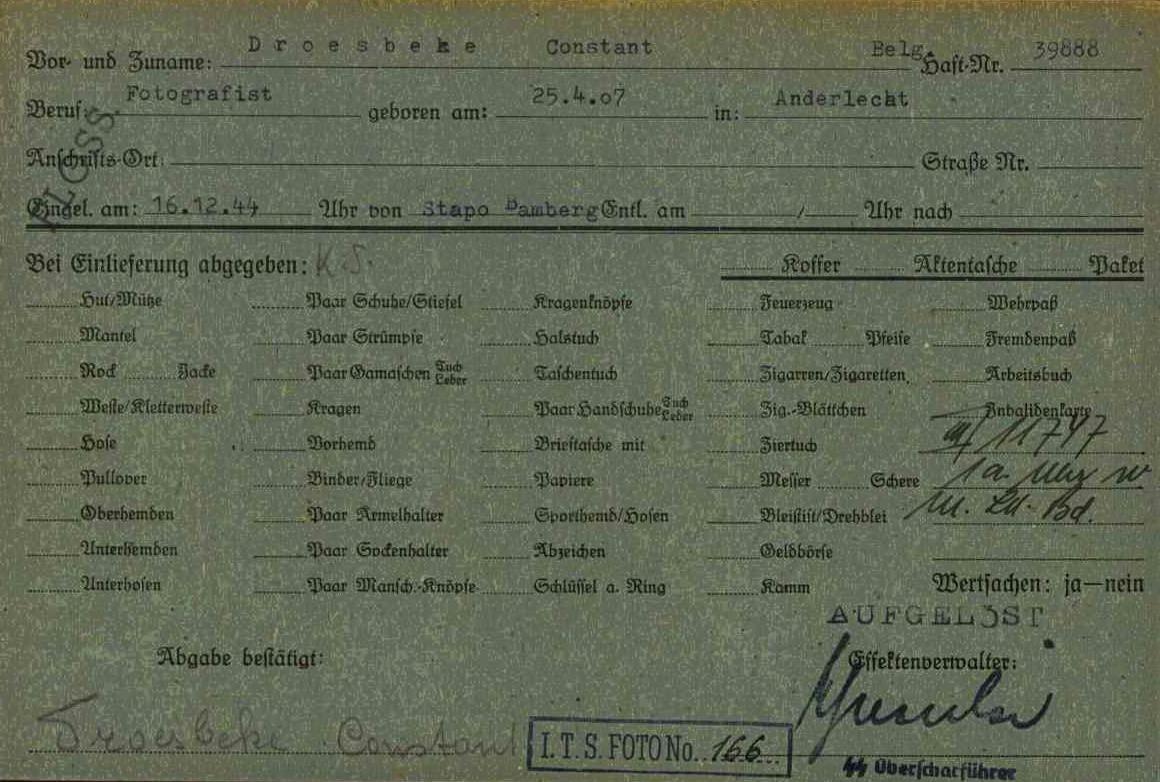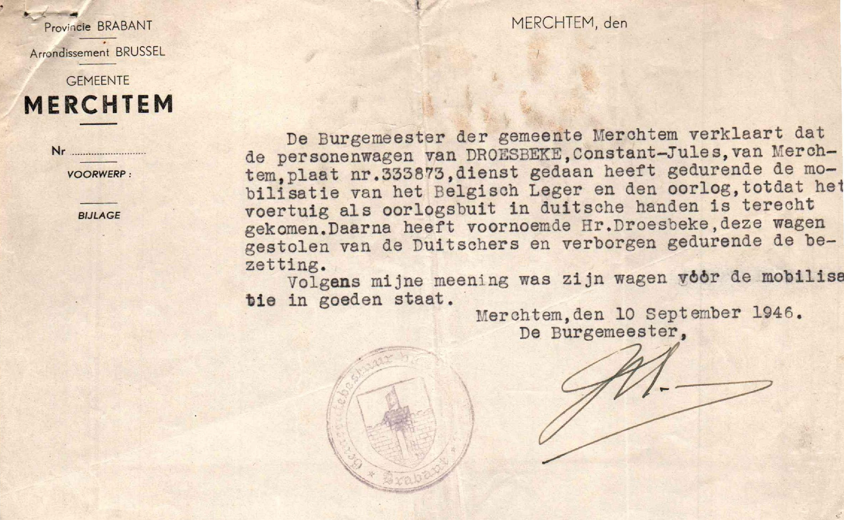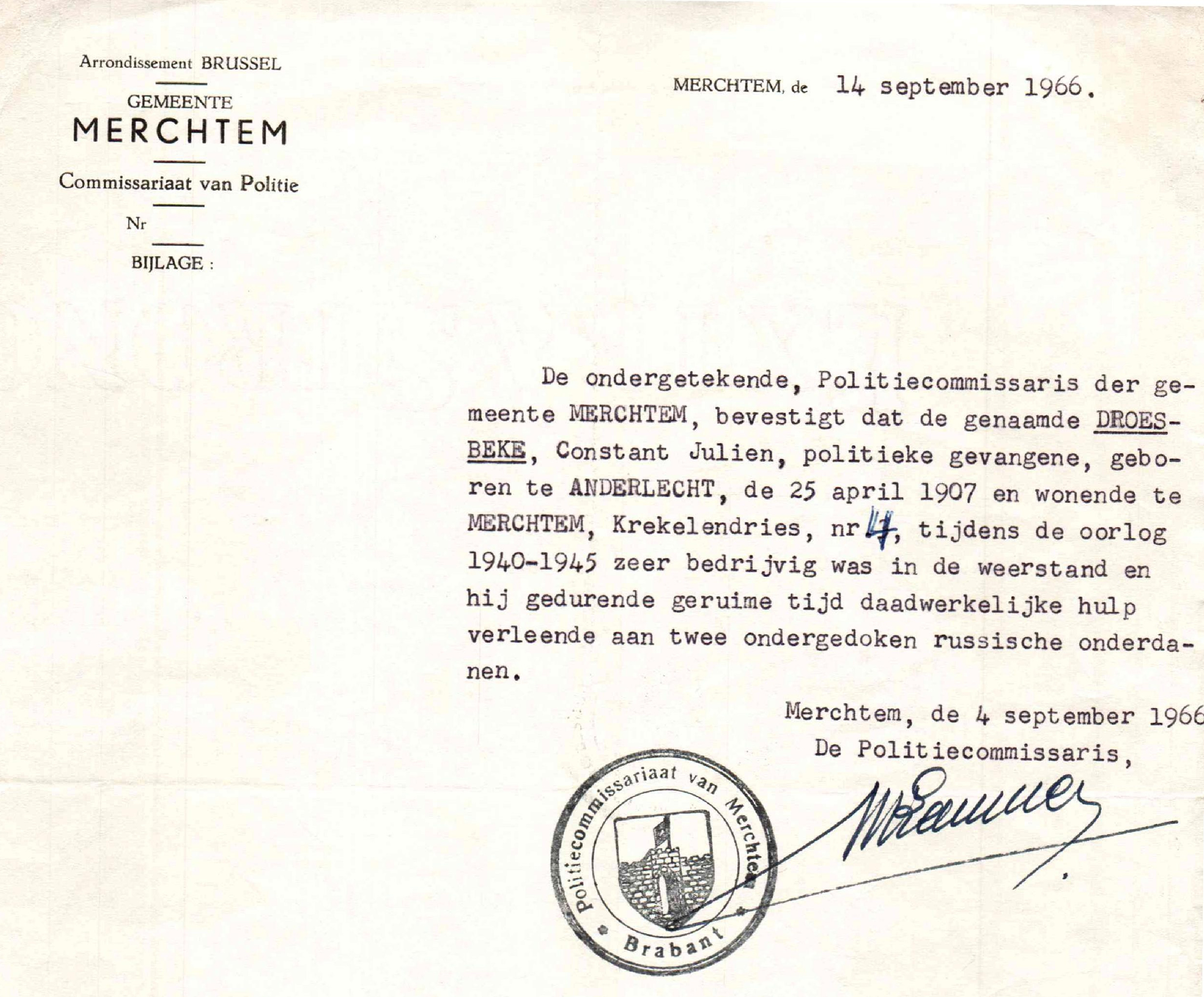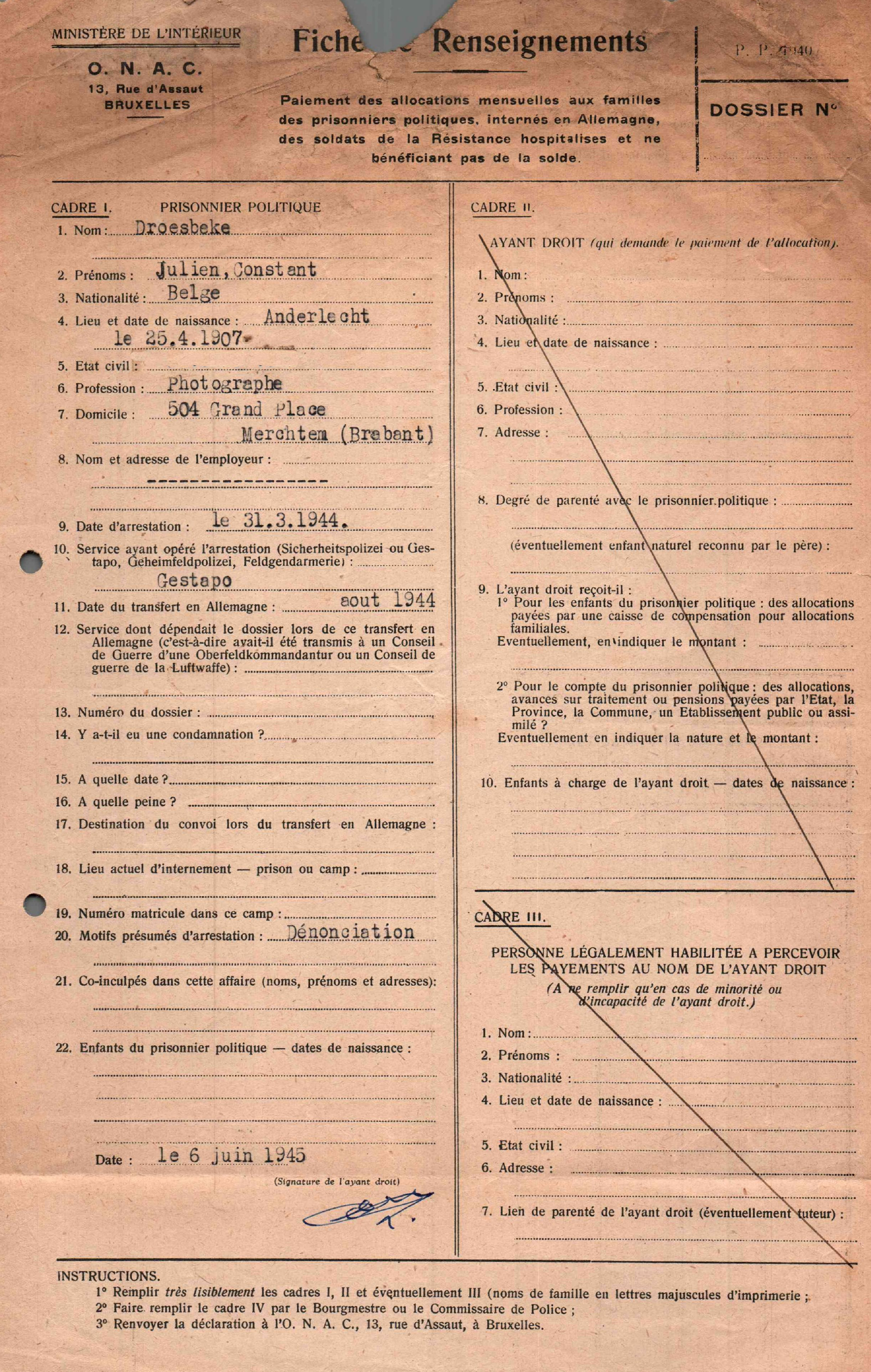 - Personalia: Constant Julien Droesbeke werd geboren te Anderlecht op 25 april 1907. Hij was sinds 1936 beroepsfotograaf te Merchtem. Adres: Krekelendries 4. Hij deed zijn militaire dienst bij het 2de regiment Gidsen, waarin hij eerste wachtmeester werd.
