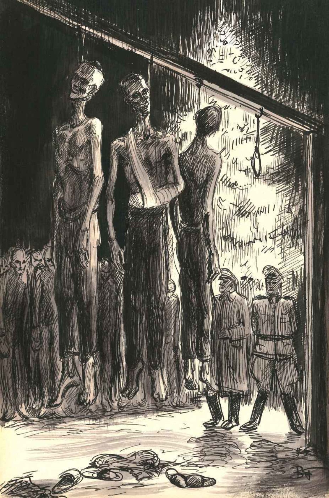 De veroordeelden schoven in rij onder het dwarshout van het doel waaraan de stroppen bengelden. Medegevangenen, helpers van de kapo’s voor een bord soep, plaatsen onder de dwarsbalk stoelen waarop ze planken legden. Een geïmproviseerd schavot. Het spektakel was is zijn laatste stadium. De zes voor de strop schreden vastberaden naar de dood. Er lag iets heldhaftig in hun blik en ze scholden de beulen de huid vol. Op een wenk stapten ze op het verhoog. Een officier trad naar voor en sprak theatraal het vonnis uit: de doodstraf met de strop. “Keine Gnade!”. Het wou mij voorkomen dat de stem woede inhield. Wat hadden de zes misdaan? Niemand wist het, maar de barse officier maakte eenieder duidelijk dat orde en tucht in het kamp moesten worden gerespecteerd. De helpers legden de stroppen rond de hals van de zes. Een ervan schreeuwde nog enkel zinnen. Ik begreep ze niet. Overigens, ik kende hun nationaliteit niet. Plots werd het muisstil. De beulen stonden klaar. Afkeer voor een regime dat met levens spotte, overviel de zovele duizenden die tegen wil en dank de terechtstellingen moesten bijwonen.