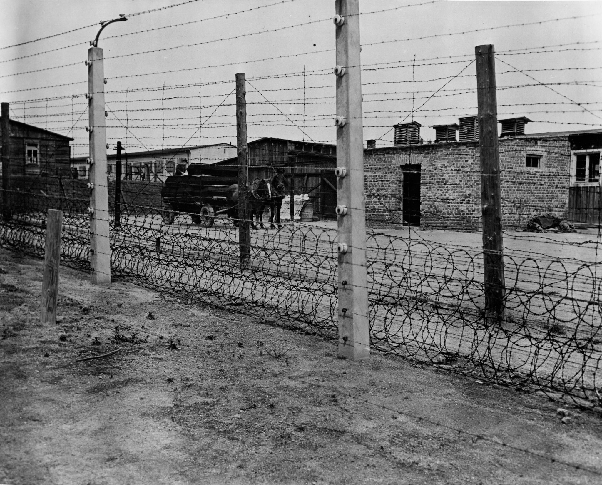 De ingang van het concentratiekamp was majestueus. Twee enorme zuilen droegen een massief ijzeren hekken, stevig vergrendeld. We bleven ervoor staan. Een SS-bewaker kwam haastig en zichtbaar woedend, met knuppel in de vuist, op ons af. “Weitermarschieren”, schreeuwde hij. Hij telde. Het zware hek sloot zich eerder langzaam en tergend knarsend achter de colonne van 95. Toen zag ik nog beter de omheining, elektrische stroom erop ontnam hoop op ontvluchten in een streek waar vrijwel geen enkel teken op de nabijheid van menselijk leven wees.