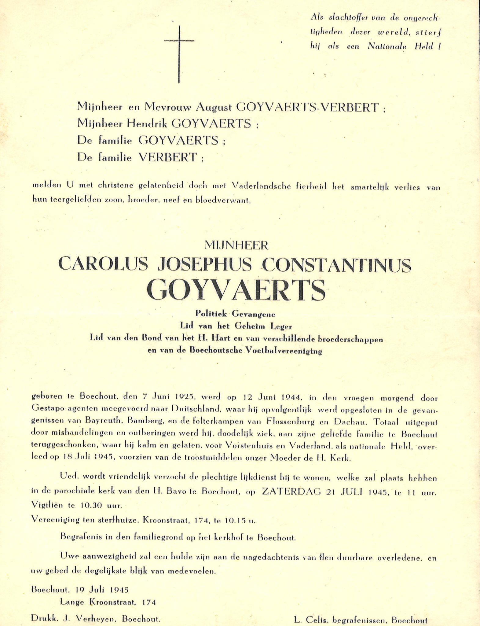 ’s Anderendaags vertelde Karel mij dat zijn broer Hendrik met een werk-commando op transport was gezet. Ik wist beter, doch zweeg. Karel heeft nooit de dood van zijn broer geweten. Na de bevrijding van Flossenbürg keerde hij zo verzwakt naar huis terug dat hij nog slechts enkele weken heeft geleefd. Karel verkeerde toen nog in de waan dat zijn broer elders in Duitsland rondhing.