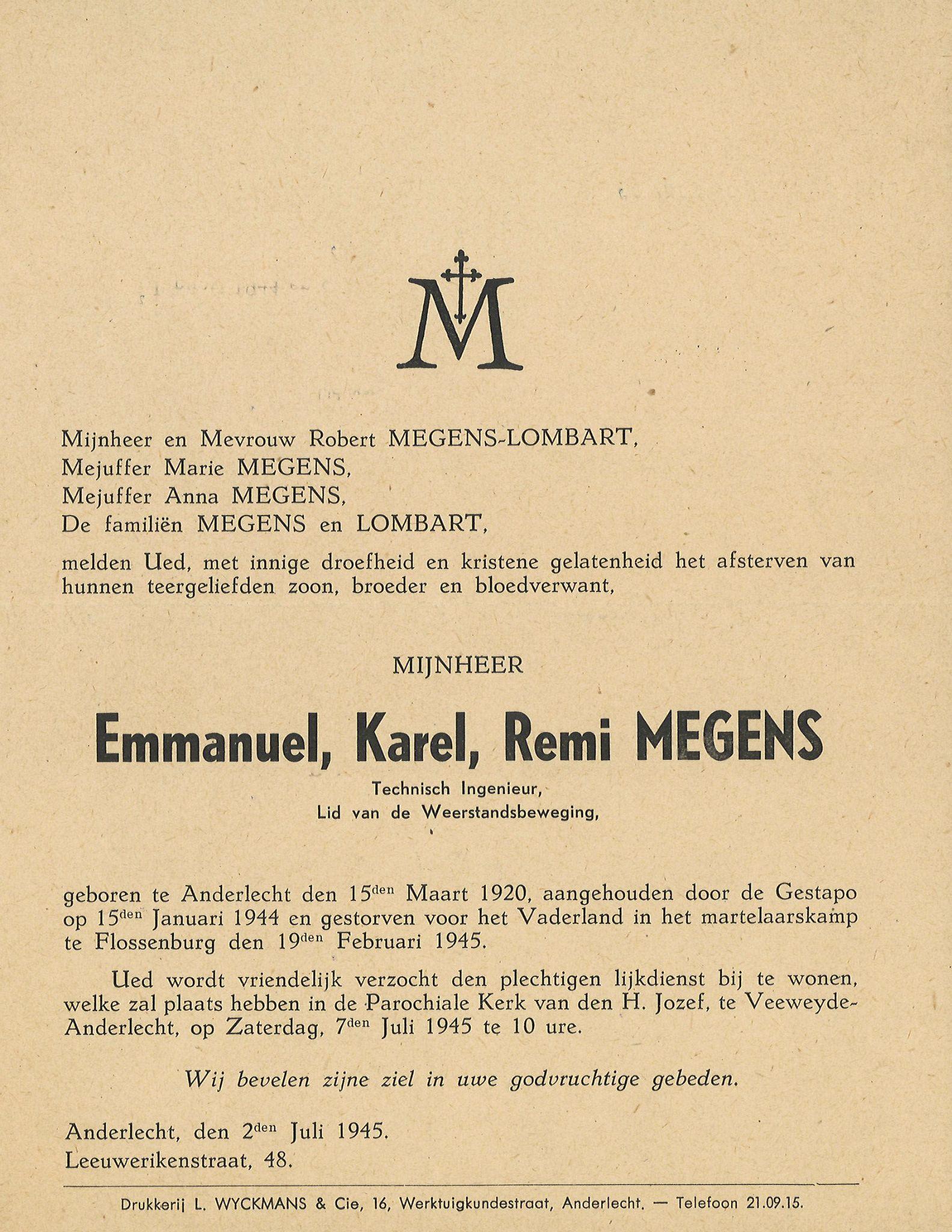 Emmanuel Megens uit de Leeuwerikenstraat in Anderlecht was zo uitgeput dat hij met moeite op de been kon blijven. Tijdens de soepbedeling struikelde hij en stak een fractie van een seconde te laat zijn kom onder de pollepel. De van dienst zijnde kapo werd uitzinnig van woede, nam een blok hout, dat hem onder de hand viel en sloeg die man zo maar dood. Waren dat gedrogeerde beesten? Abnormalen? Waanzinnigen?