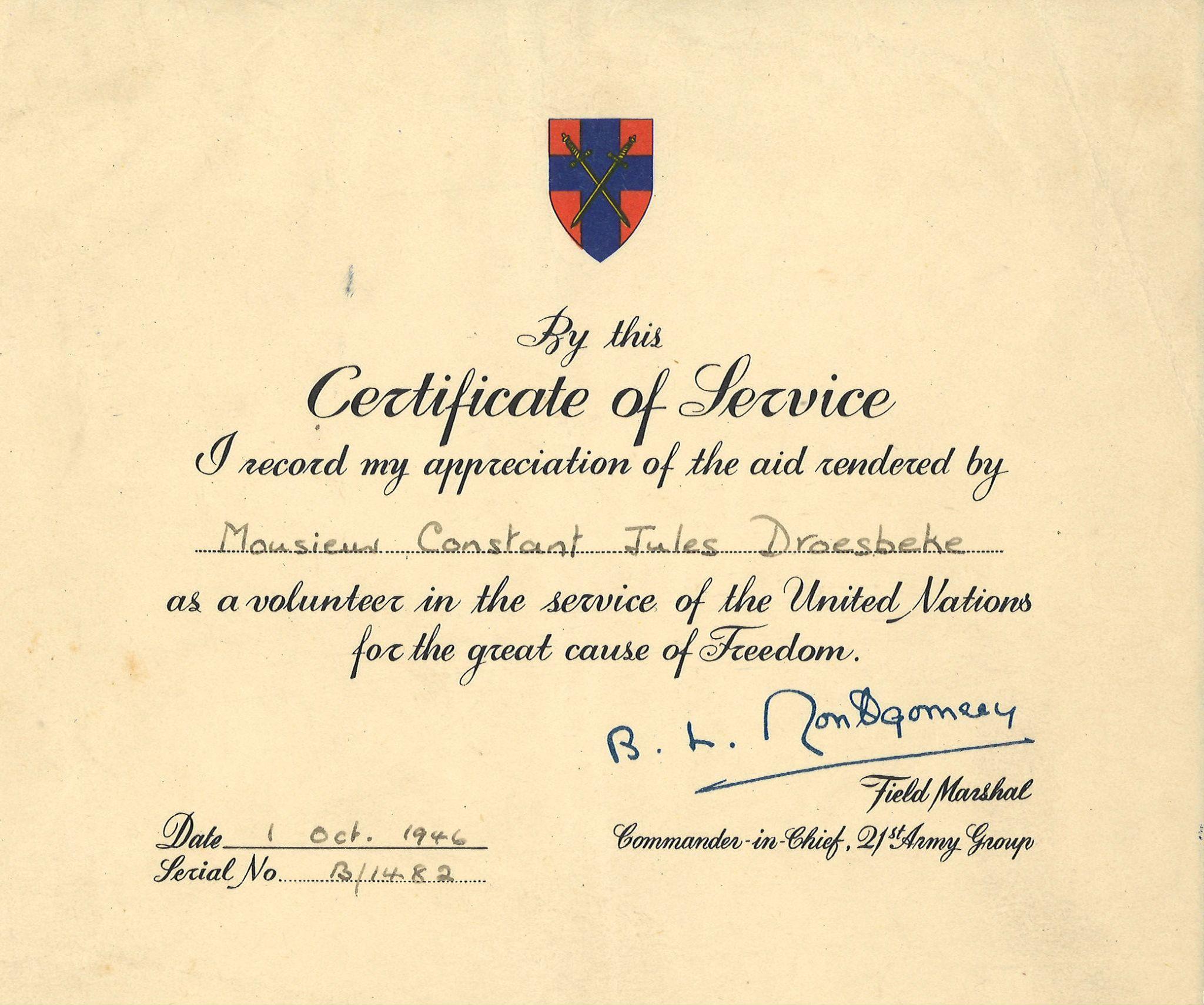 “De ondergetekende, politiecommissaris van de gemeente Merchtem, bevestigt dat de genaamde Droesbeke Constant Julien, politieke gevangene, geboren te Anderlecht, de 25 april 1907 en wonende te Merchtem, Krekelendries 4, tijdens de oorlog 1940-1945 zeer bedrijvig was in de weerstand en hij gedurende geruime tijd daadwerkelijke hulp verleende aan twee ondergedoken Russische onderdanen. Merchtem, 14 september 1966.”